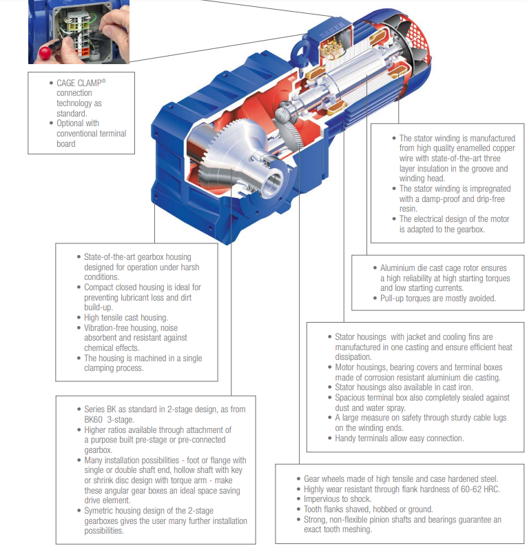 BG 系列減速電機是我們最暢銷和最經濟合算的產品,為可靠性與經濟性樹立了新標準,其中包括諸多無與倫比的標準功能與特點。逆變器友好型設計不僅可確保目前輕松集成,而且還能滿足未來需求。標配有確保與您的應用輕松集成的英制或公制尺寸輸出軸。BG 減速電機擁有靈活的安裝選件,包括支腳、基座、表面與法蘭解決方案。電機接線盒可以安裝在圍繞電機架旋轉 90° 的其他位置,實現無與倫比的集成可能性。